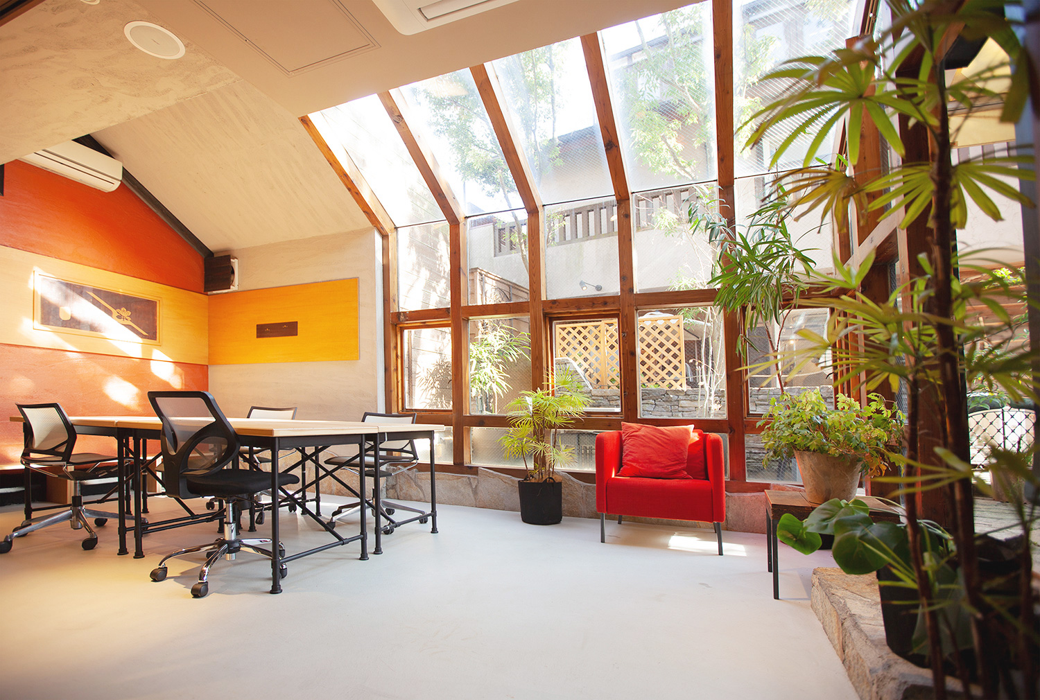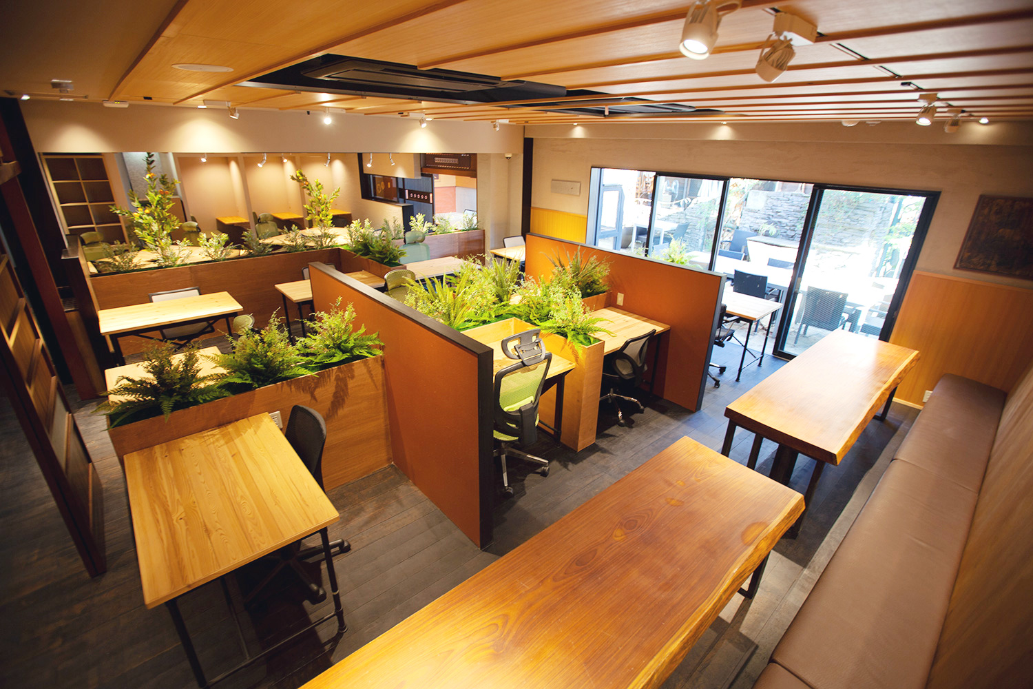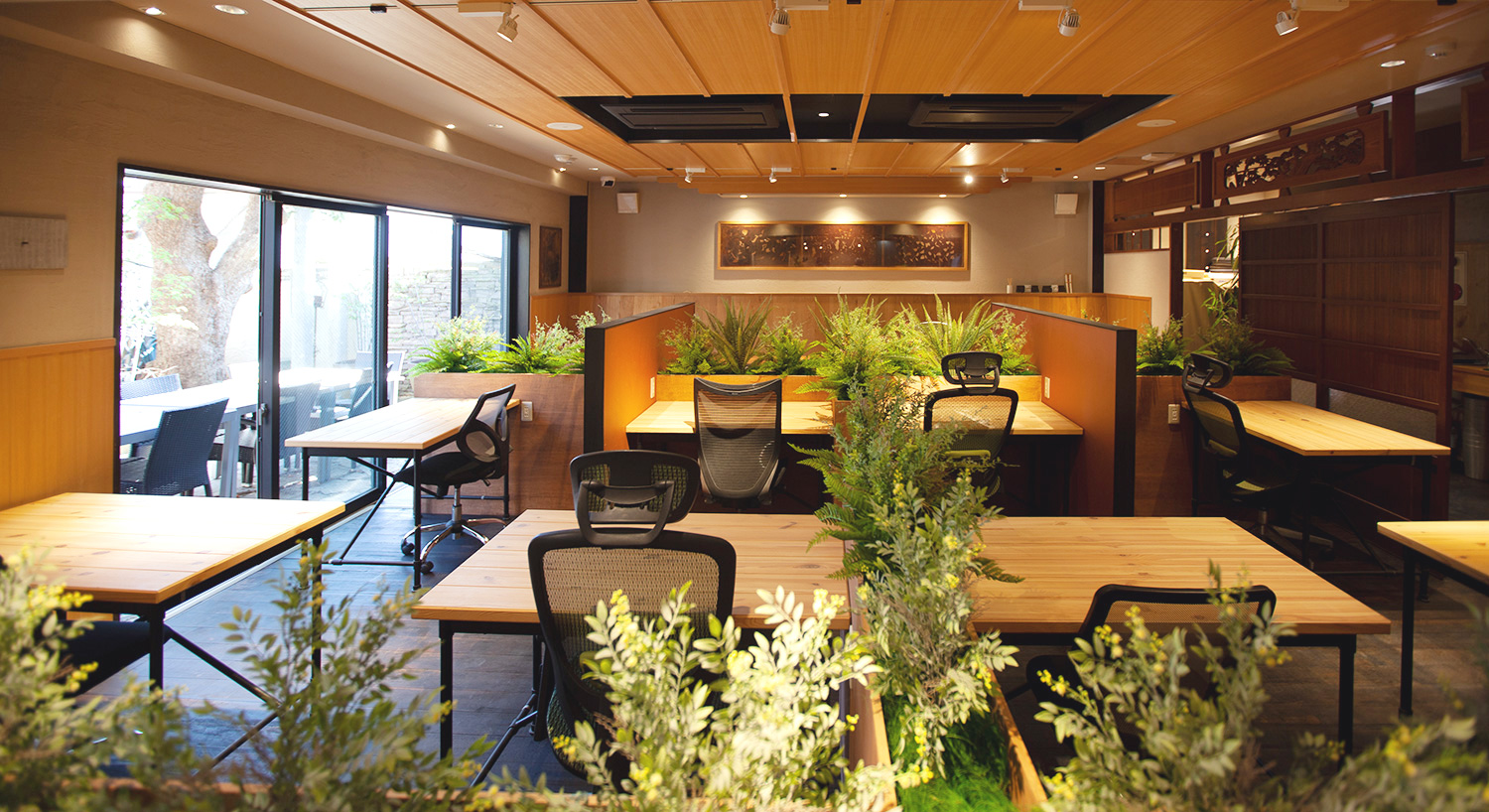 緑が一杯の日光が射しこむ癒し空間にて、お客様も満足するシェアオフィスが完成しました。