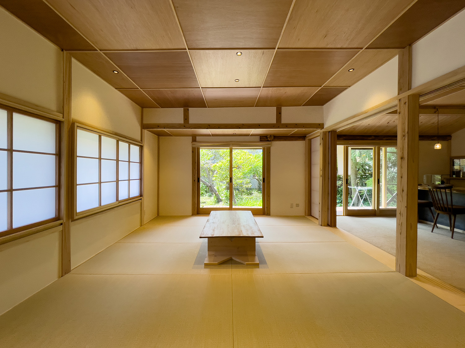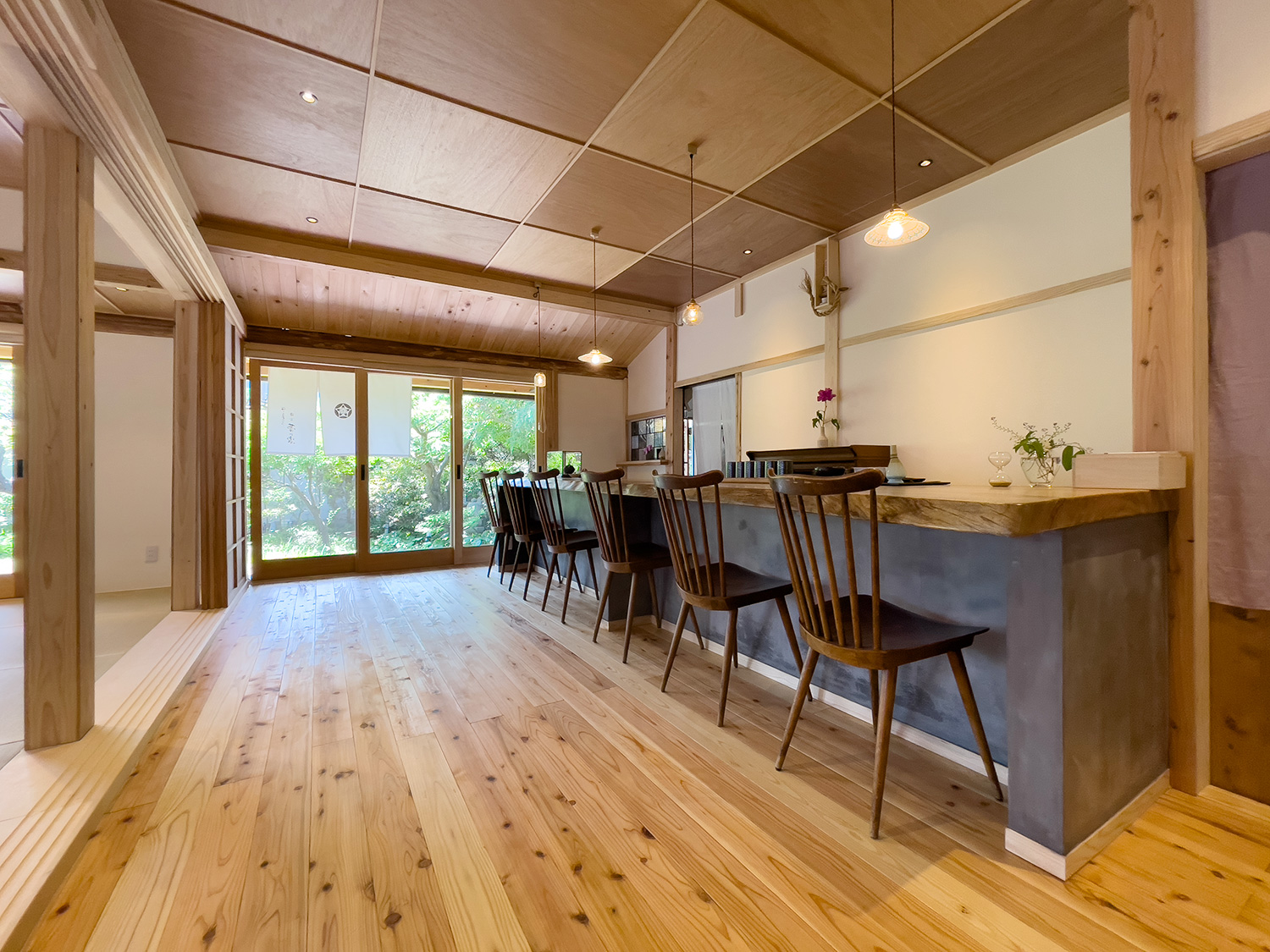 古き良き日本の文化を伝えていきたいというお店のコンセプトに添い、国産の素材でお店作りをしました。和室には空間に映える吉村障子を採用し、畳も縁無しの一畳物にして、トラディショナルな中にもモダンを感じる美しい空間になりました。